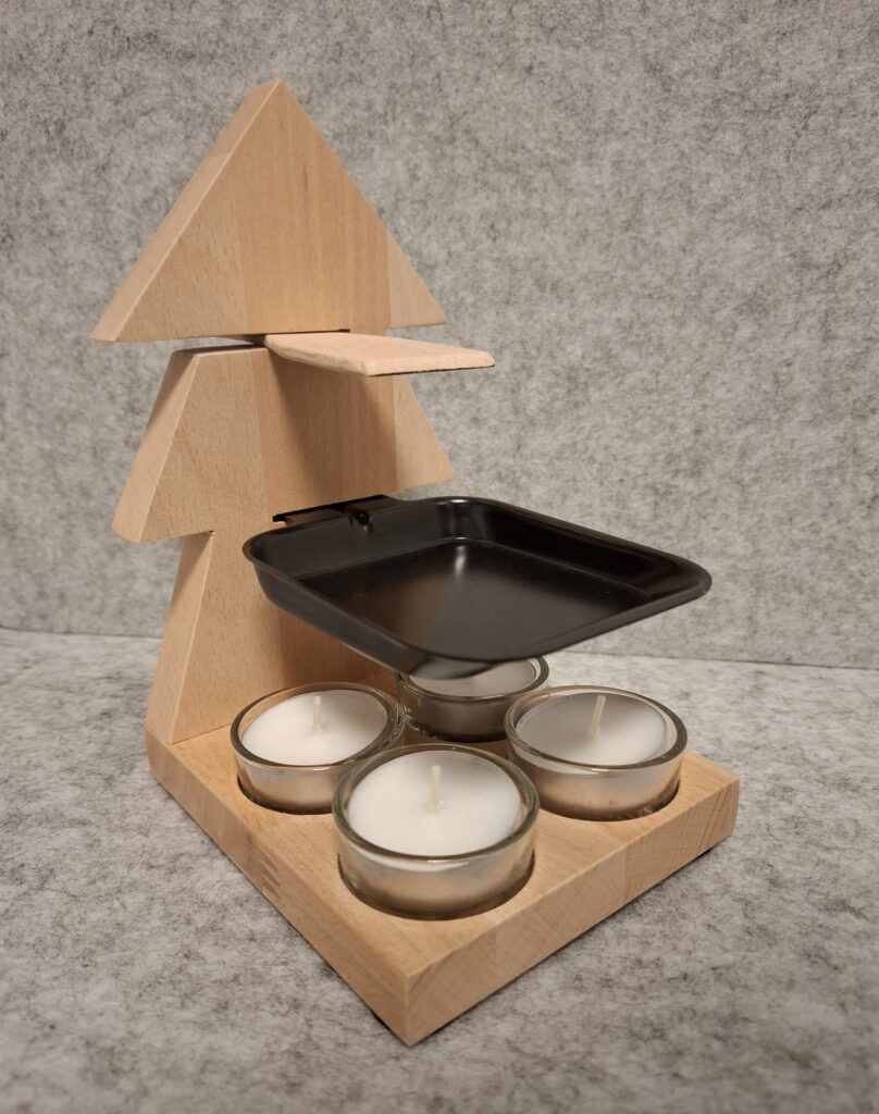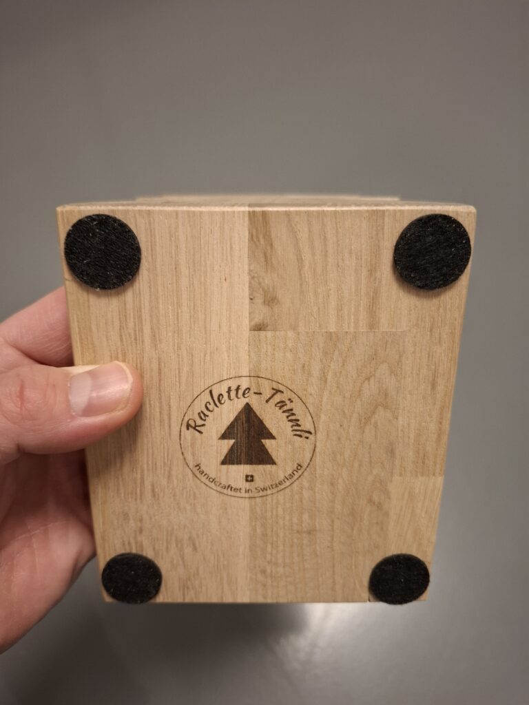 Jedes Raclette-Tännli durchläuft mehrere Arbeitsschritte und wird in unserer improvisierten Werkstatt (Garage) produziert. Das wir die Tännli in der Schweiz herstellen, macht uns stolz und deshalb trägt auch jedes Raclette-Tännli das Logo auf dem Boden mit dem Schweizer-Kreuz.